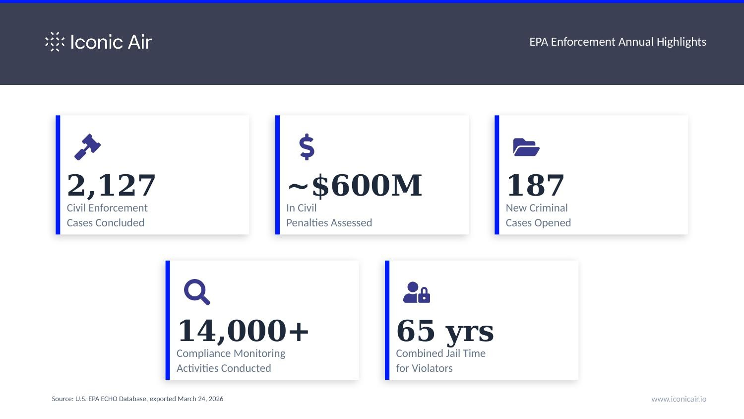 EPA concluded 2,127 civil enforcement cases in FY2025 — the highest volume in nine years. The agency assessed approximately $600 million in civil penalties, conducted over 14,000 compliance monitoring activities, and handed down a staggering 65 years of combined jail time to environmental violators. On the criminal side, 187 new cases were opened and 156 defendants were personally charged — the most since FY2016. This is not a cyclical blip. It is a sustained escalation.